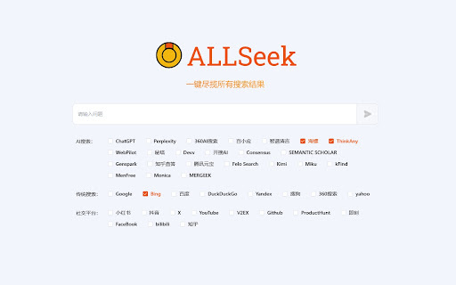 Search AI Hub is a comprehensive platform that aggregates all search results, supporting AI search (CHATGPT, Kimi, Zhipu, Mitata, etc.) and traditional search engine comparisons.
